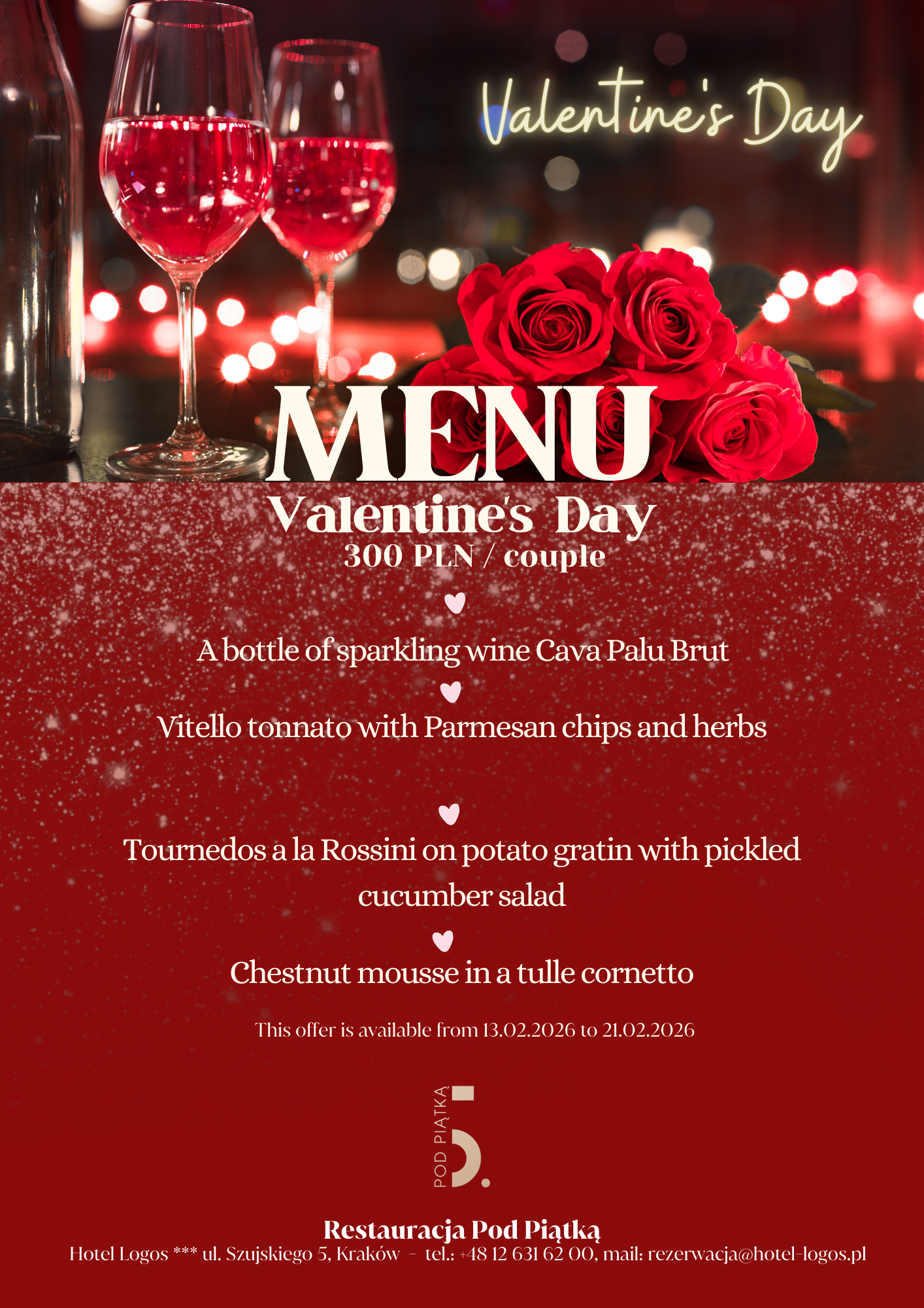 Celebrate a love every day, let us organize Valentine's Day! Sweets, wine and a little suprise in the room. What's next? Maybe a romantic dinner at the hotel restaurant "Pod Piątką"? Yes! Give yourself a moment of pleasure and fall in love with Krakow!